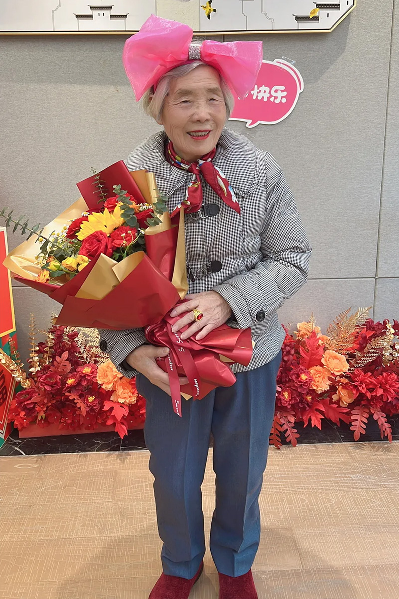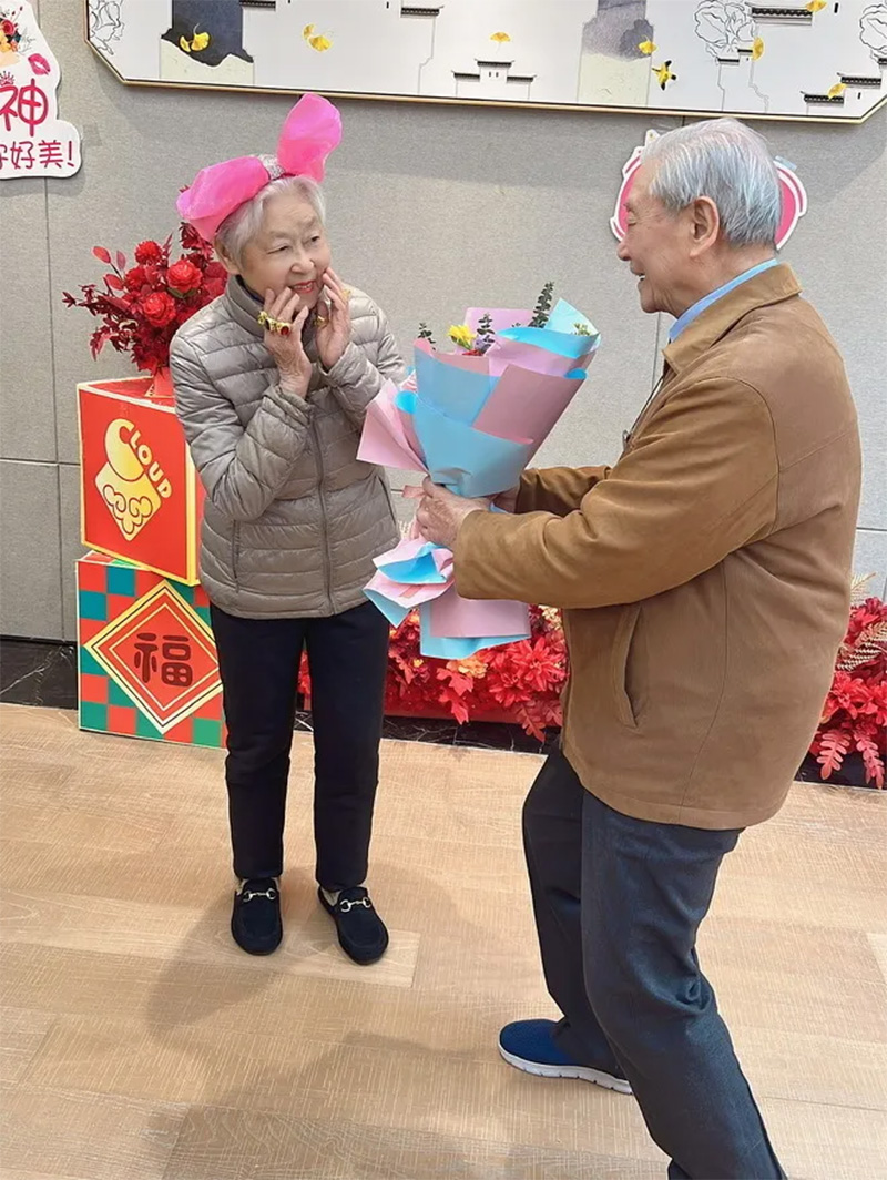 现场有一对老夫妻格外引人注目。爷爷温柔地为奶奶献上一束鲜花,奶奶满是欣喜,眼中闪烁着感动的泪花。这一刻,时间仿佛静止,他们的爱情在岁月中更加坚定。