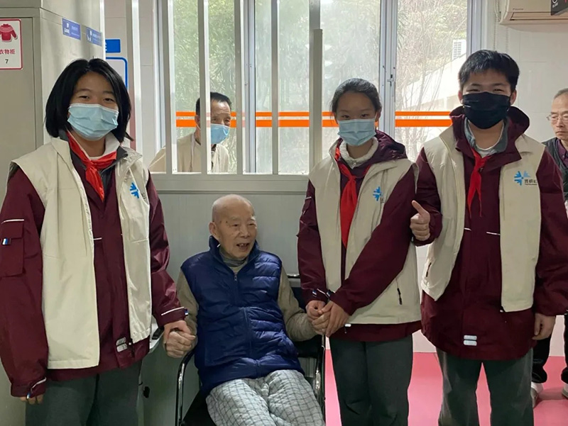 在探望百岁老人的时候,志愿者们拉着老人们的手,与他们聊天唠家常,耐心倾听他们的生活经历,细心询问他们的健康状况。老人们身体健朗,独立生活能力很强,其中一位百岁老人十分热情主动,她拿出了平时自己舍不得吃的零食点心与志愿者们一起分享,很开心地向志愿者展示自己的生活技能,并对志愿者们说 :“我还要活到200岁呢!”在交谈过程中,志愿者们深刻体会到了老人们的智慧与经验,也十分感动于他们对生活的热爱与坚韧。