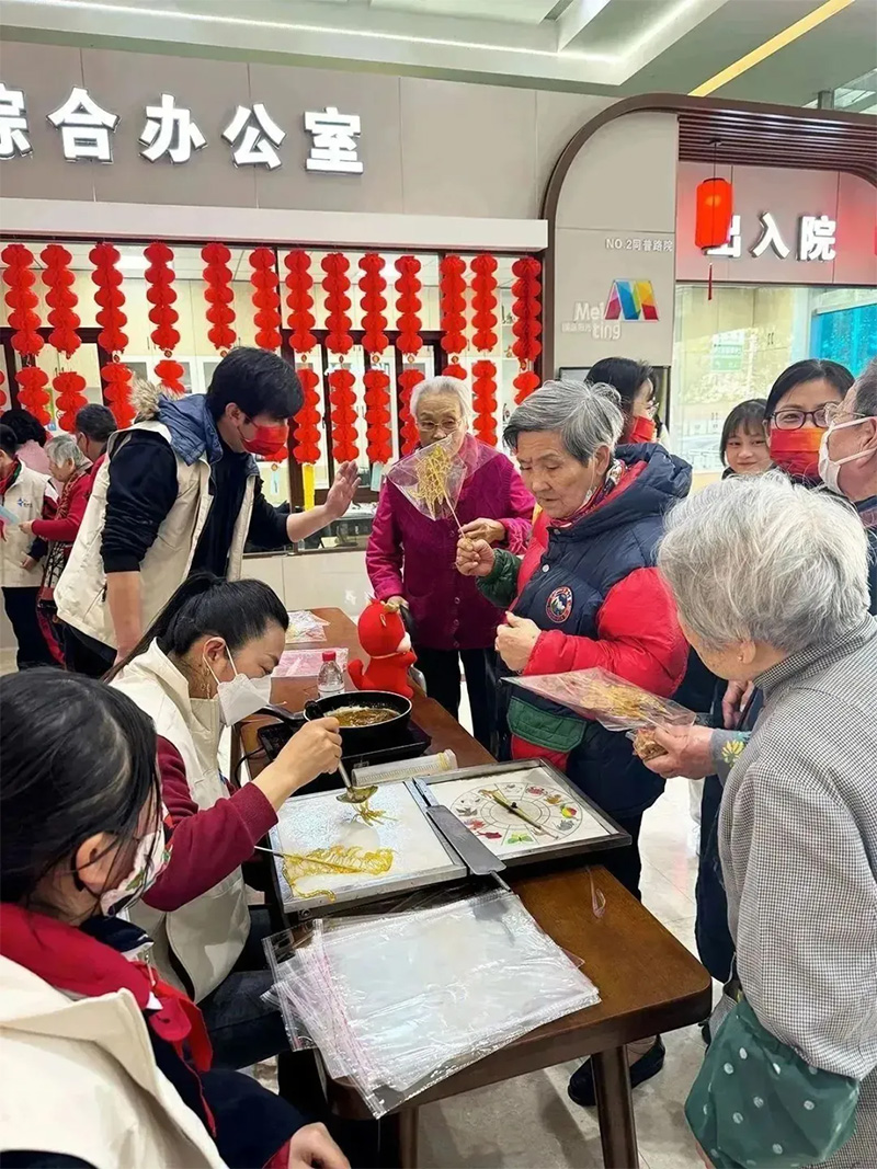 糖画制作环节更是让老人们重温了童年的记忆。制作糖画的老师手持糖勺,轻轻挥洒,糖丝如丝如缕,在空中舞动。随着她的巧手翻飞,一个个栩栩如生的糖画便在她的手中诞生。志愿者们将糖画一一送到老人们的手中,老人们接过糖画,脸上洋溢着幸福纯真的笑容。这不仅仅是一个活动环节,更是一个情感交流的过程,让老人们在分享中感受到了温暖和幸福。