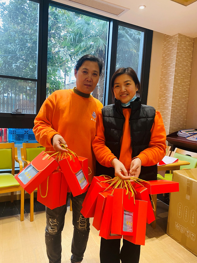 老人们完成自己的春联作品后,脸上露出了喜悦和满足的笑容。他们拿着自己的作品,仔细端详,感受着自己的努力和成就。这些春联不仅是书法艺术的展示,更是老人们对新年的祝福和对生活的热爱。同时上海壹棵松公益基金会还为每位老人准备了精美的伴手礼,表达对老人们的深深敬意和诚挚祝福。