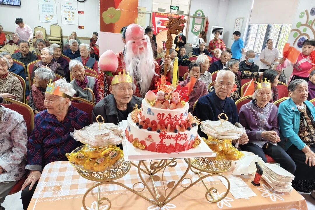 随着节目演出落幕,开启了为高寿老人祝寿的环节,现场准备了长寿面、寿桃蛋糕,祈盼长者们健康常乐。