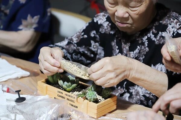 叔叔阿姨们津津有味地听完志愿者讲解多肉植物的基本常识、养护常识后,在志愿者的指导下,叔叔阿姨们迫不及待地将种植土倒入木盒中,手持小铲,专注地在小花盆里挖呀挖呀挖,小心翼翼地将多肉栽入土壤中,每一株都显得格外珍贵;随后铺上铺面石、撒上蓝沙绿沙,点缀上各式各样的小鸭子、小海豚……不一会儿功夫,通过叔叔阿姨的“魔法”,一盆盆可爱又精致的多肉景观一一亮相,瞧他们的脸上都洋溢着孩子般的笑容!