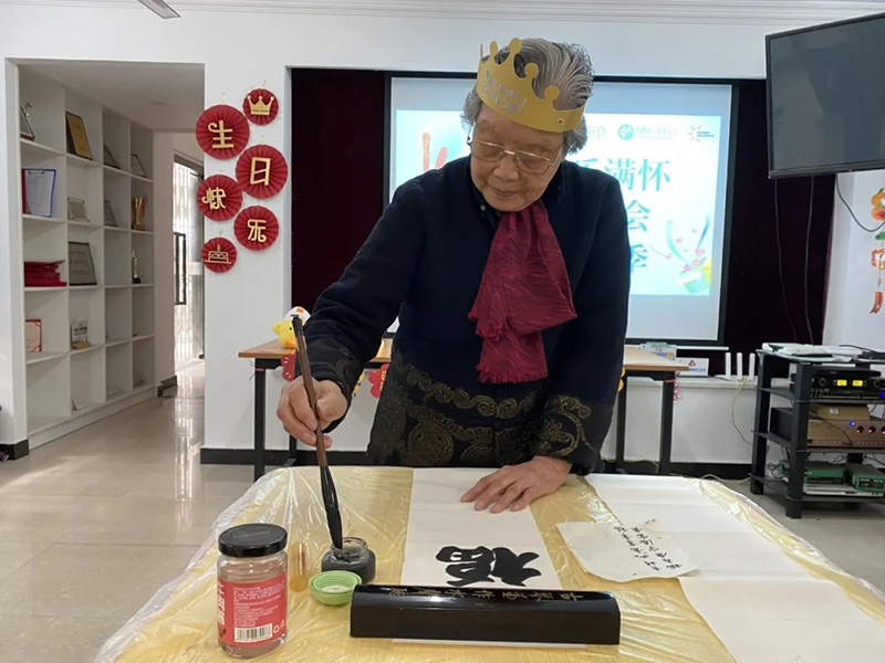 在生日会现场,更有寿星兴奋地手书一副对联——“福寿康宁添富贵,吉祥如意享幸福”,来表达对大家、对彼此的祝福!