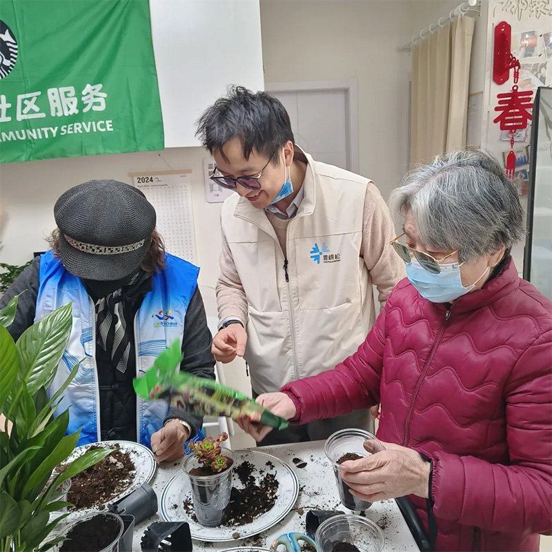 秉持着环保理念,壹棵松走进社区,邀请居民一起耕耘生机盎然的绿意。种植过程中,志愿者们与居民时而欢声笑语,交流着栽种绿植的经验,时而低头思索,认真照料着自己眼前的绿植。志愿者们也积极地向居民传授了巧用咖啡渣种植多肉植物的技巧和好处。大家满心欢喜,把对春天的希冀倾注在一盆盆可爱多姿的多肉上。现场氛围温馨和谐而又充满生机。