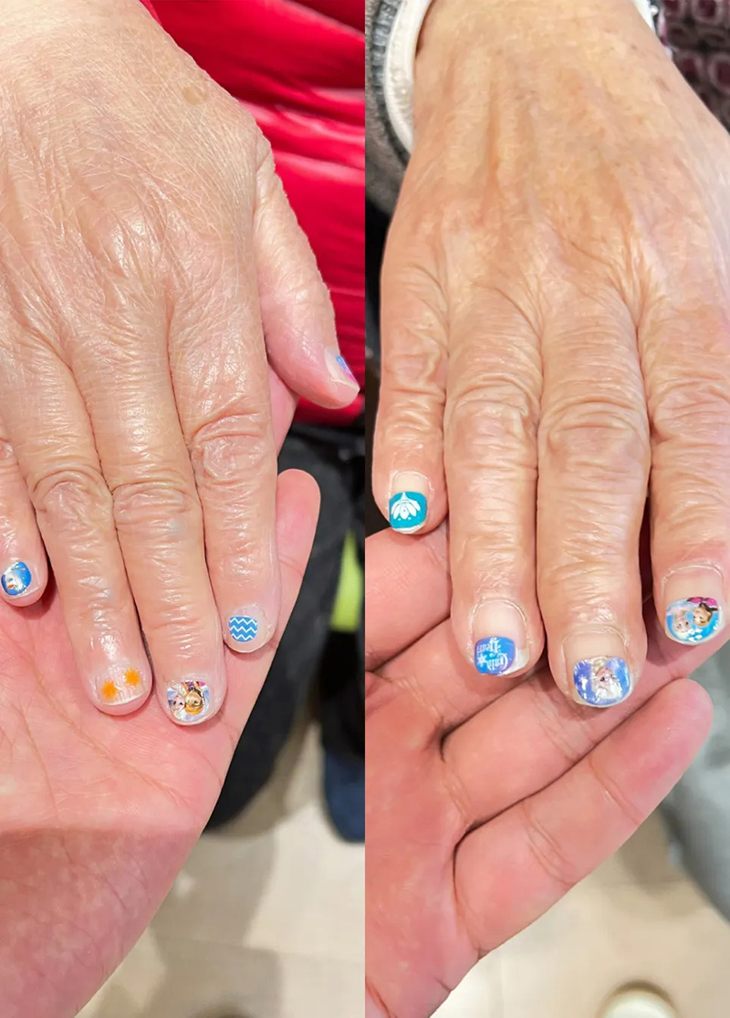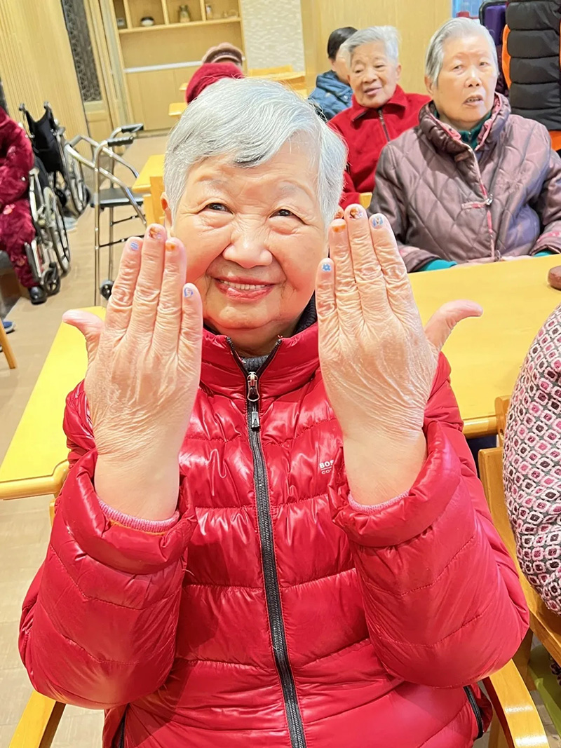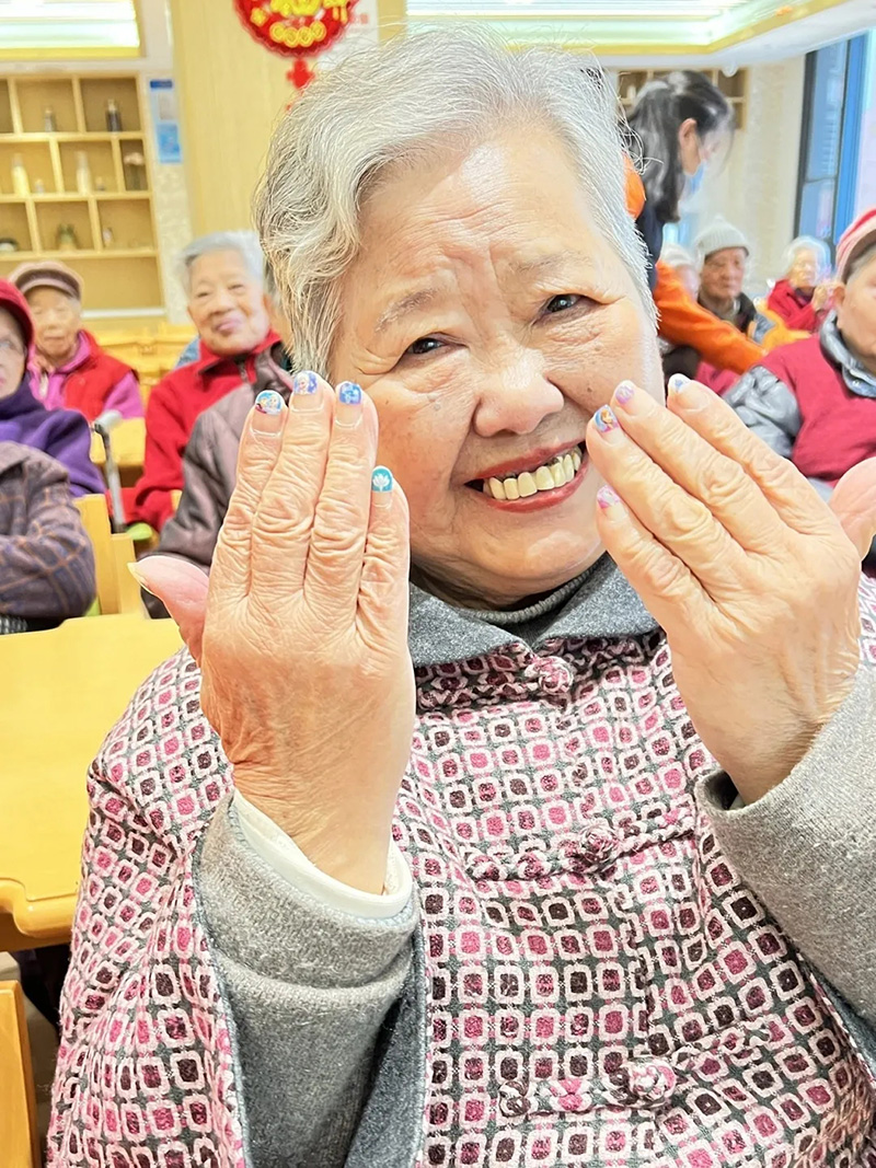 活动现场气氛热烈,老人们脸上洋溢着幸福的笑容。志愿者们和养老院员工为老人们贴上美甲、画上眉毛、带上头花,让她们的指尖闪耀着五彩斑斓的光芒,面容焕发出青春的光彩。