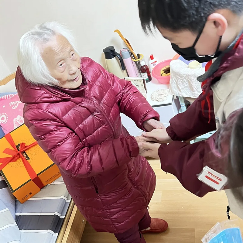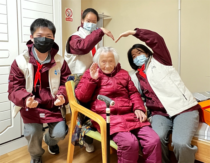 在探望百岁老人的时候,志愿者们拉着老人们的手,与他们聊天唠家常,耐心倾听他们的生活经历,细心询问他们的健康状况。老人们身体健朗,独立生活能力很强,其中一位百岁老人十分热情主动,她拿出了平时自己舍不得吃的零食点心与志愿者们一起分享,很开心地向志愿者展示自己的生活技能,并对志愿者们说 :“我还要活到200岁呢!”在交谈过程中,志愿者们深刻体会到了老人们的智慧与经验,也十分感动于他们对生活的热爱与坚韧。