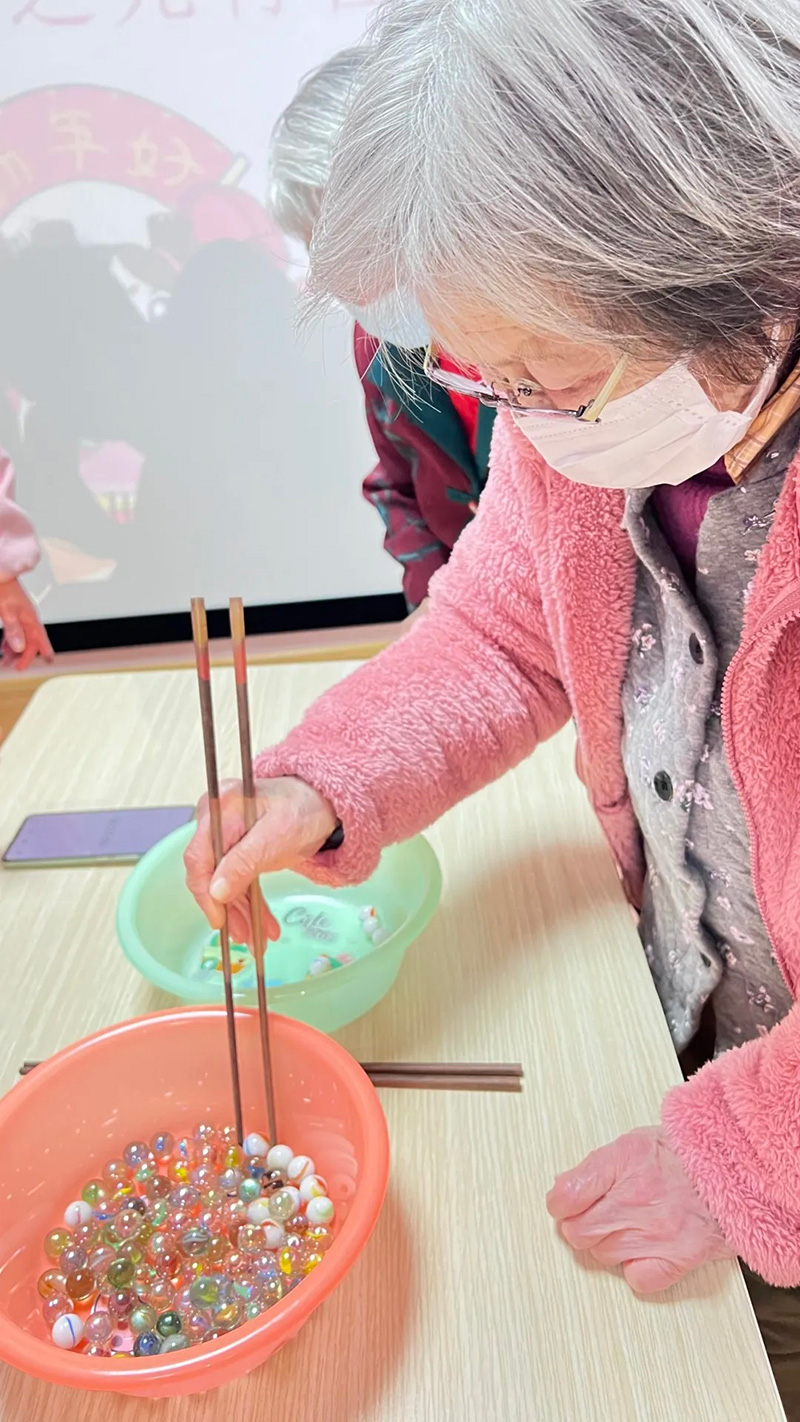 夹弹珠游戏区同样火爆。老人们围坐在桌子旁,用筷子小心翼翼地夹着碗里的弹珠。弹珠光滑,但老人们的手却异常稳定。他们或眯起眼睛,或轻轻调整筷子的角度,使出各种招数,力求将弹珠稳稳地夹起。比赛过程中,大家互相鼓励加油,现场氛围既紧张又和谐。