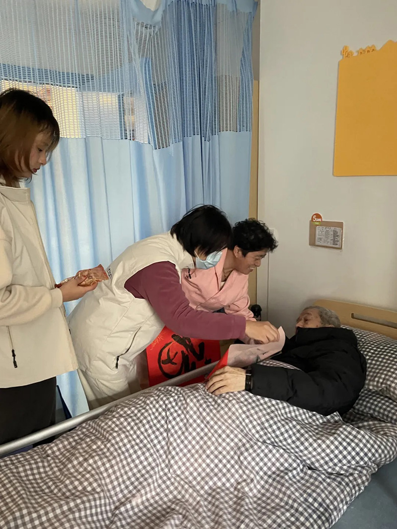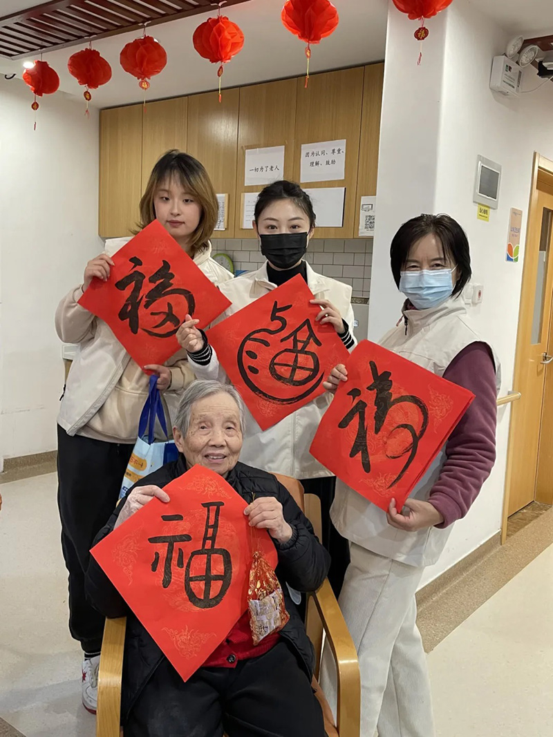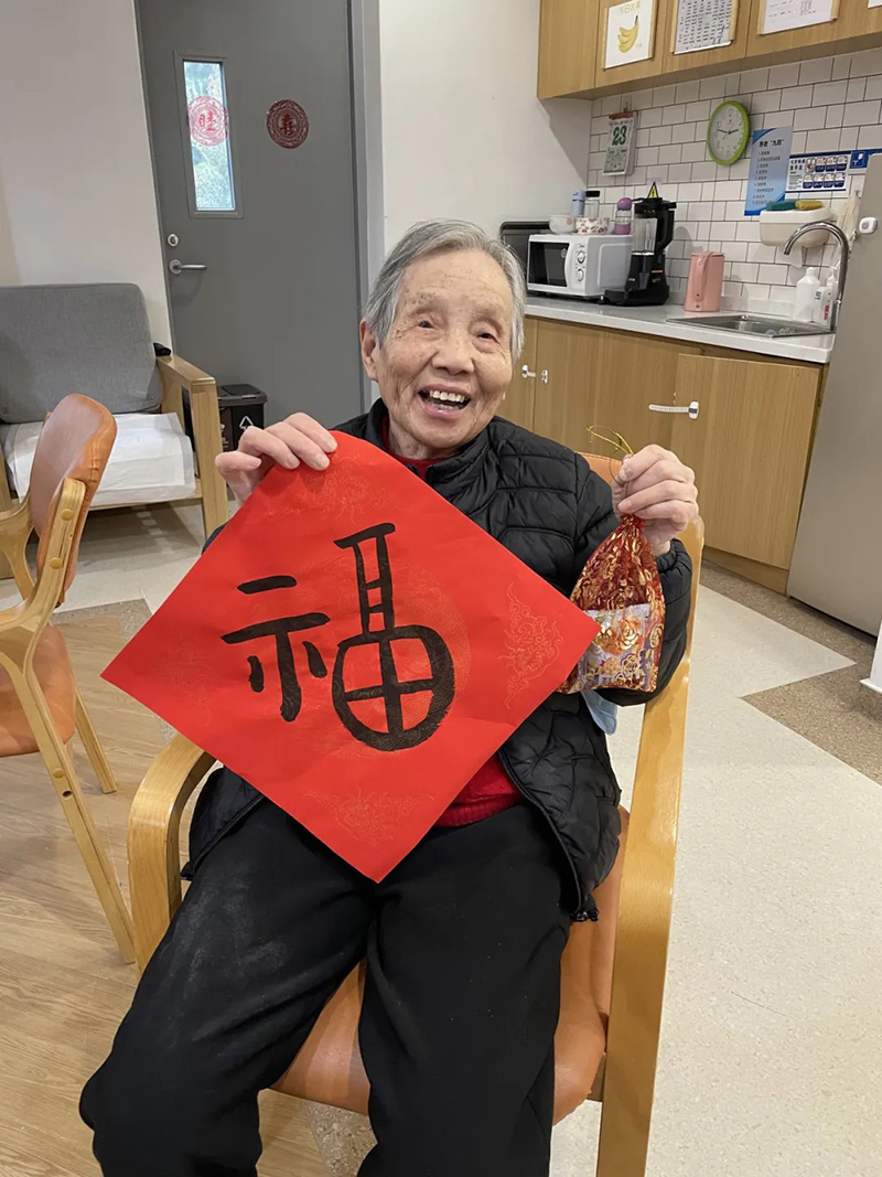 特别值得一提的是,壹棵松的志愿者们还精心为卧床老人组织了拜访送福字的活动。他们分成多组,分别前往老人们的房间,为他们送上亲手书写的“福”字和精心挑选的零食。这不仅是对老人们的深情祝福,也是为他们的生活增添一份美好。当志愿者们将承载着满满祝福的“福”字和零食送到老人们手中时,他们的脸上都洋溢出了幸福的笑容。这一刻,卧室仿佛变成了一个个小型的温馨家庭聚会场所,充满了温馨和欢乐。这样幸福祥和的气氛,让志愿者们的所有付出都变得如此值得,也让壹棵松更加坚定地开展各项活动来提升老年人的幸福感。