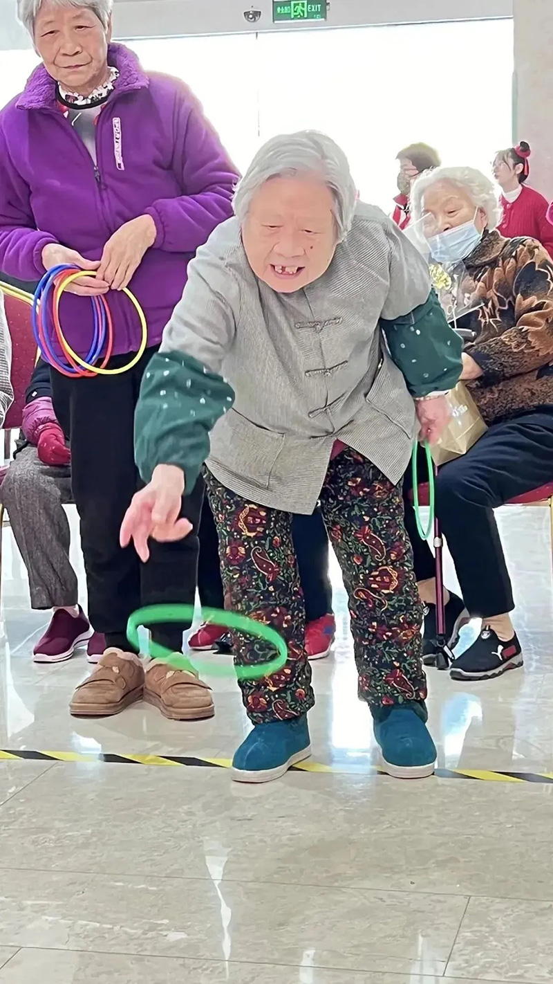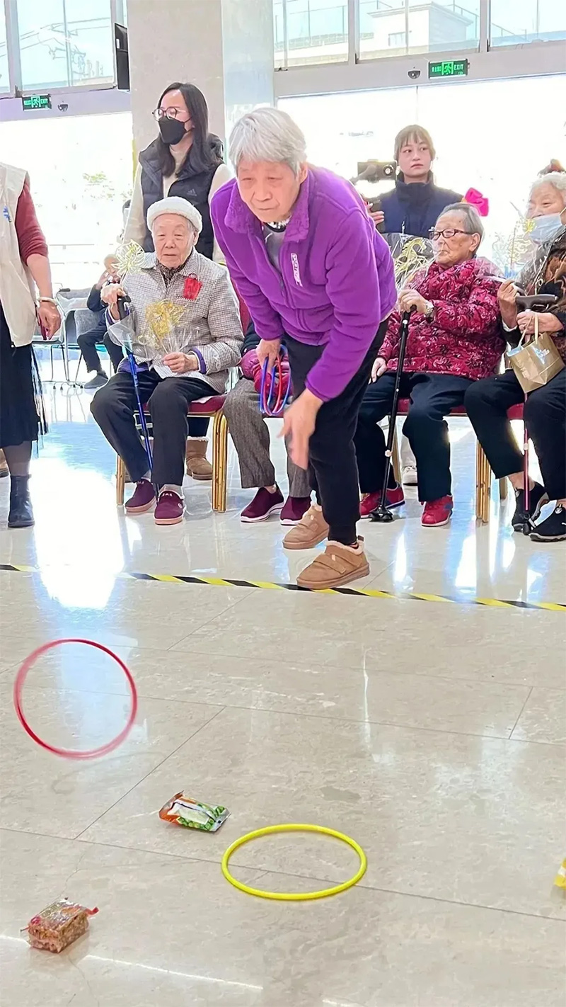 在套圈游戏中,老人们手握着圈圈,尝试将其套中目标,彼此竞相一决高下。每当志愿者将套圈交到他们手中时,老人们迅速判断目标的角度,巧妙地扔出去。令人惊叹的是,许多老人几乎每次都能成功地套中目标,每一次胜利都在现场掀起热烈的掌声和欢呼声。