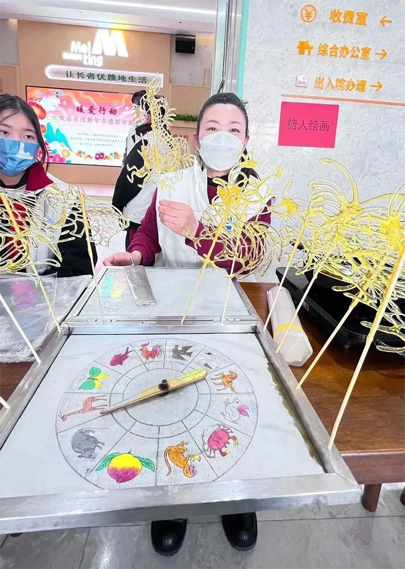 2024年2月18日,壹棵松公益基金会前往上海美源养老院,开展暖爱行动迎元宵游园会活动。本次暖爱行动不仅给老人们送去新年的祝福,还特别设置了非遗文化糖画制作环节,老人们感受传统手艺,每份糖画都成为了独一无二的艺术品,老人们得以重温儿时记忆,感受到了传统艺术的魅力,使整个活动更富有文化内涵。