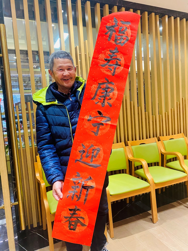 老人们完成自己的春联作品后,脸上露出了喜悦和满足的笑容。他们拿着自己的作品,仔细端详,感受着自己的努力和成就。这些春联不仅是书法艺术的展示,更是老人们对新年的祝福和对生活的热爱。同时上海壹棵松公益基金会还为每位老人准备了精美的伴手礼,表达对老人们的深深敬意和诚挚祝福。