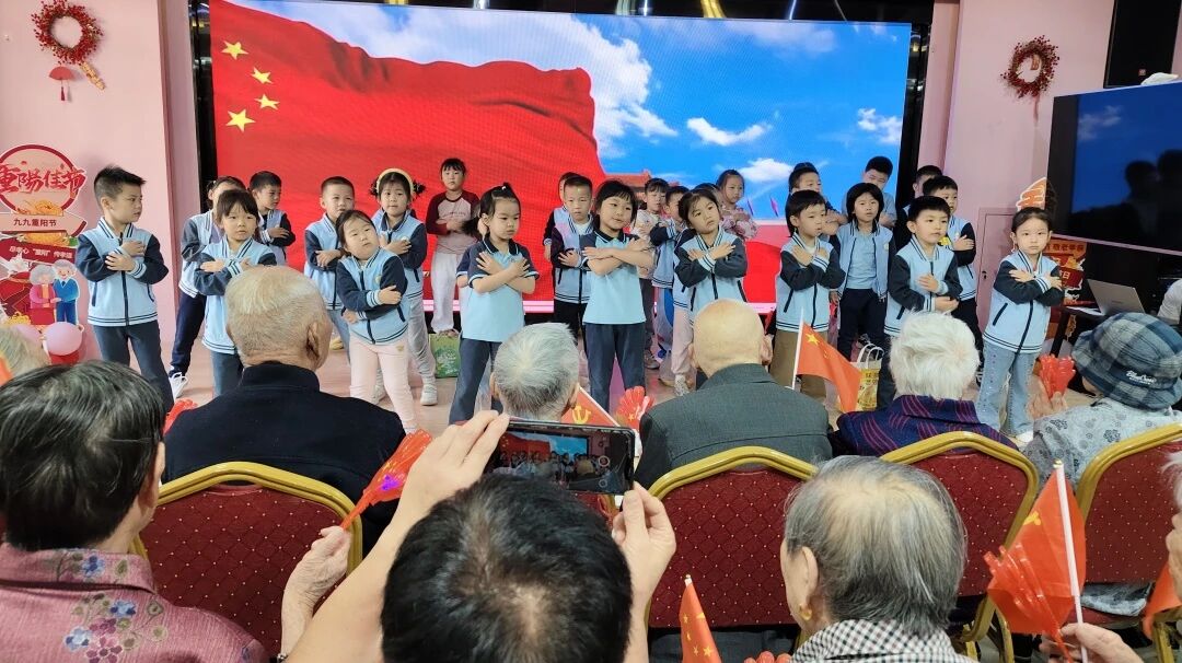 来自小精灵幼儿园的小朋友们也为老朋友们送来天籁般的歌声,并为老人们捶背捶腿,现场一派幸福祥和。
