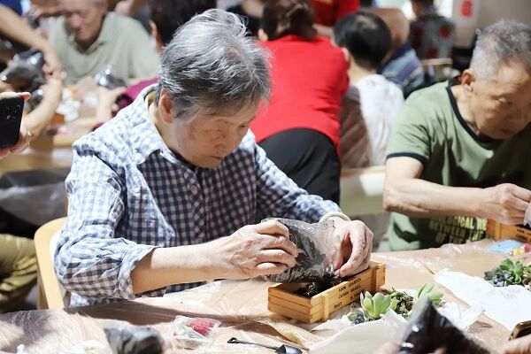 叔叔阿姨们津津有味地听完志愿者讲解多肉植物的基本常识、养护常识后,在志愿者的指导下,叔叔阿姨们迫不及待地将种植土倒入木盒中,手持小铲,专注地在小花盆里挖呀挖呀挖,小心翼翼地将多肉栽入土壤中,每一株都显得格外珍贵;随后铺上铺面石、撒上蓝沙绿沙,点缀上各式各样的小鸭子、小海豚……不一会儿功夫,通过叔叔阿姨的“魔法”,一盆盆可爱又精致的多肉景观一一亮相,瞧他们的脸上都洋溢着孩子般的笑容!