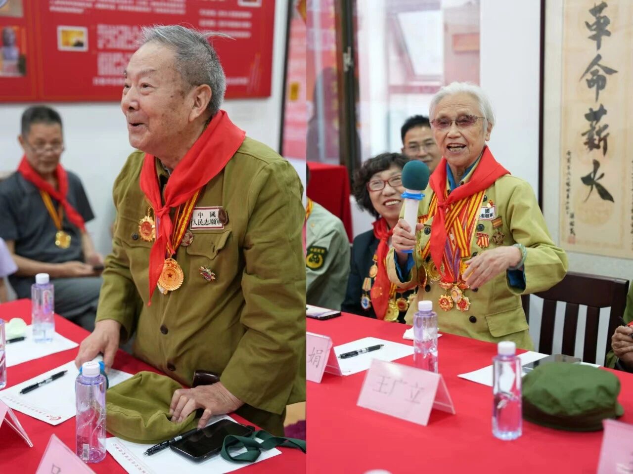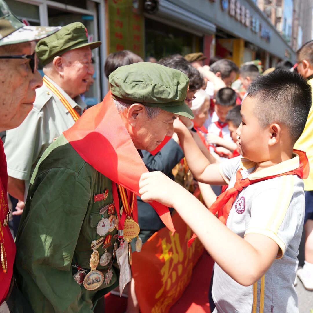 会议现场,退役军人身着昔日戎装,胸前佩戴纪念勋章和少先队员们亲手为他们系上鲜艳的红领巾,集体唱响军歌,嘹亮的歌声回荡在会场,仿佛穿越时空隧道,将在场的每一位都带回了那段光辉岁月。