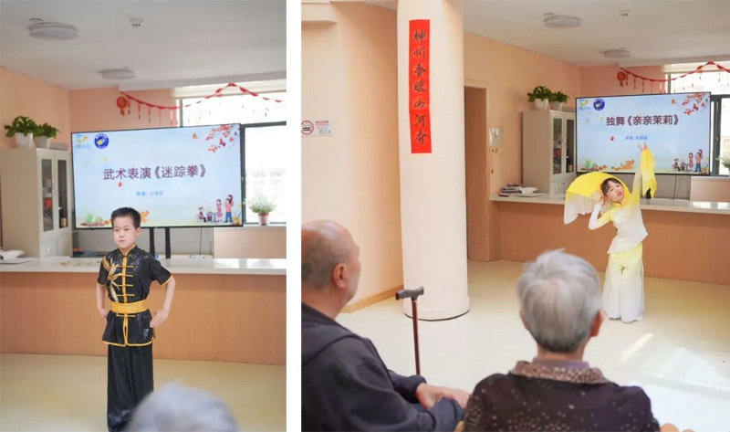 在宽阔的场地,小志愿者们化身成一个个小艺术家,用稚嫩的声音、生动的表情和充满活力的舞蹈,为老人们带来了一场精彩绝伦的演出。老人们坐在台下,认真欣赏着表演。听到相声《我要不一样》,老人们捧腹大笑,仿佛回到了年轻时的欢乐时光;观赏着吉他弹唱《青春舞曲》和独舞《亲亲茉莉》,老人面带微笑,轻轻打着节拍,感受着青春的活力和纯真;而武术表演更是让老人们一同体会到了中华武术的博大精深,大家叹为观止。